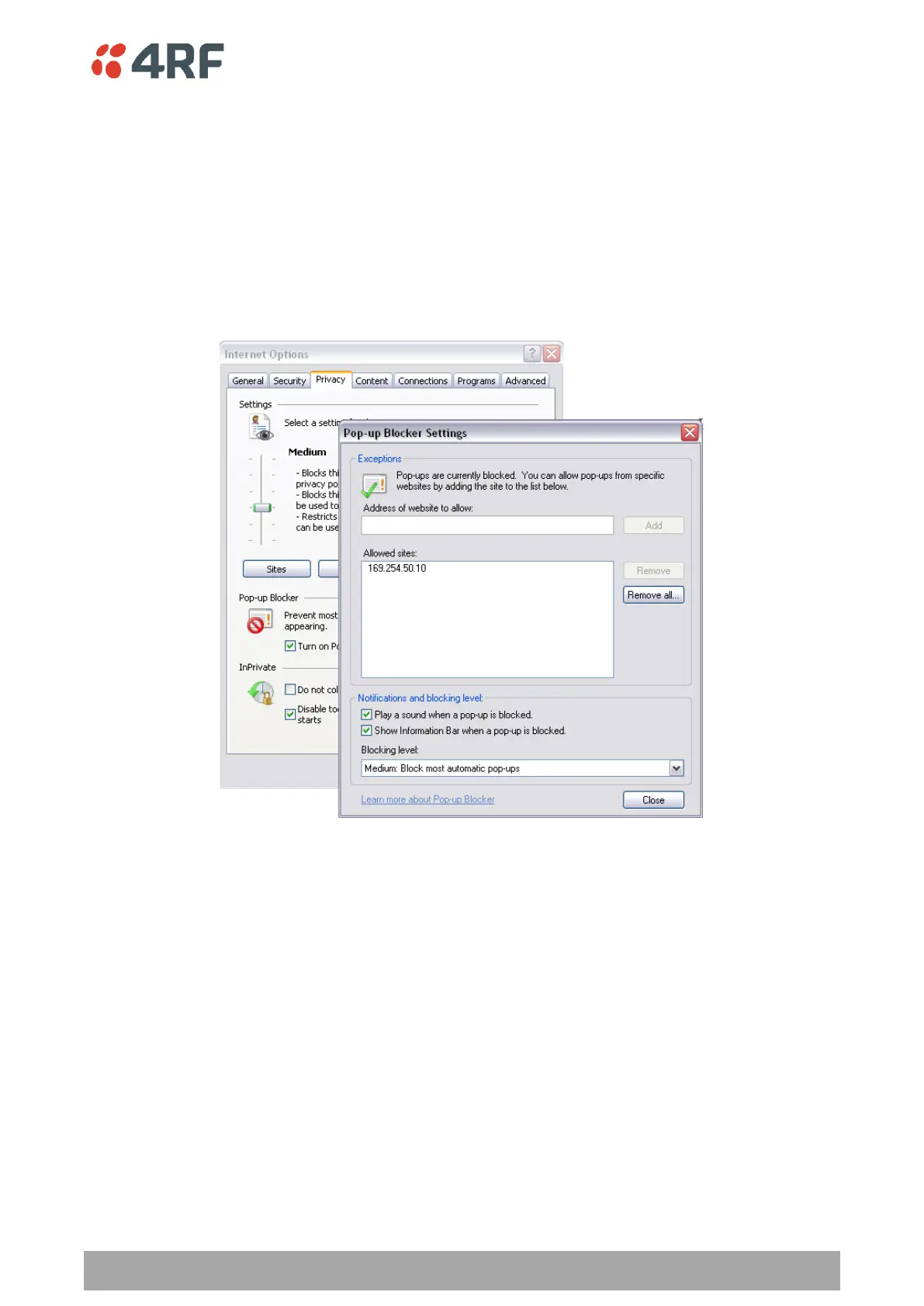 4. Set the ‘Address of Web site to allow’ to the radio address or set the ‘Blocking Level’ to ‘Low: Allow