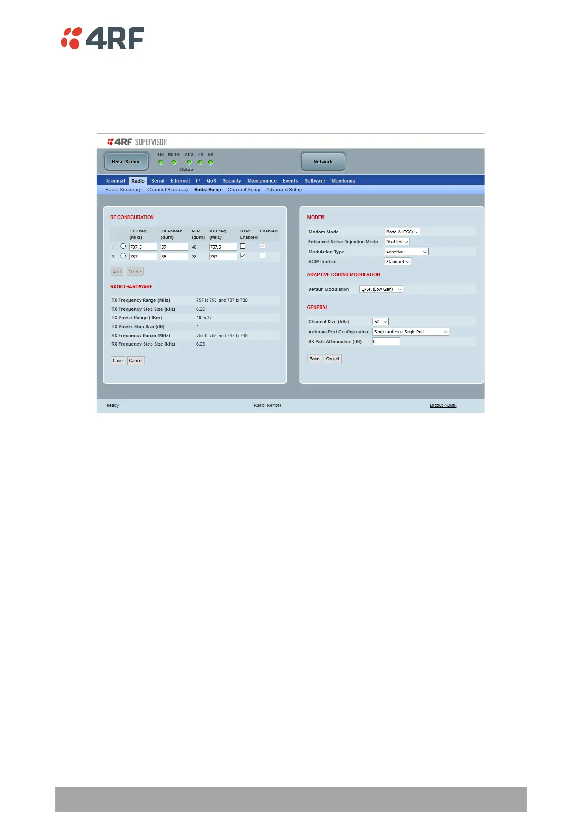 RF configuration profiles allows for two sets of TX Frequency, RX Frequency, TX Power and ATPC. The