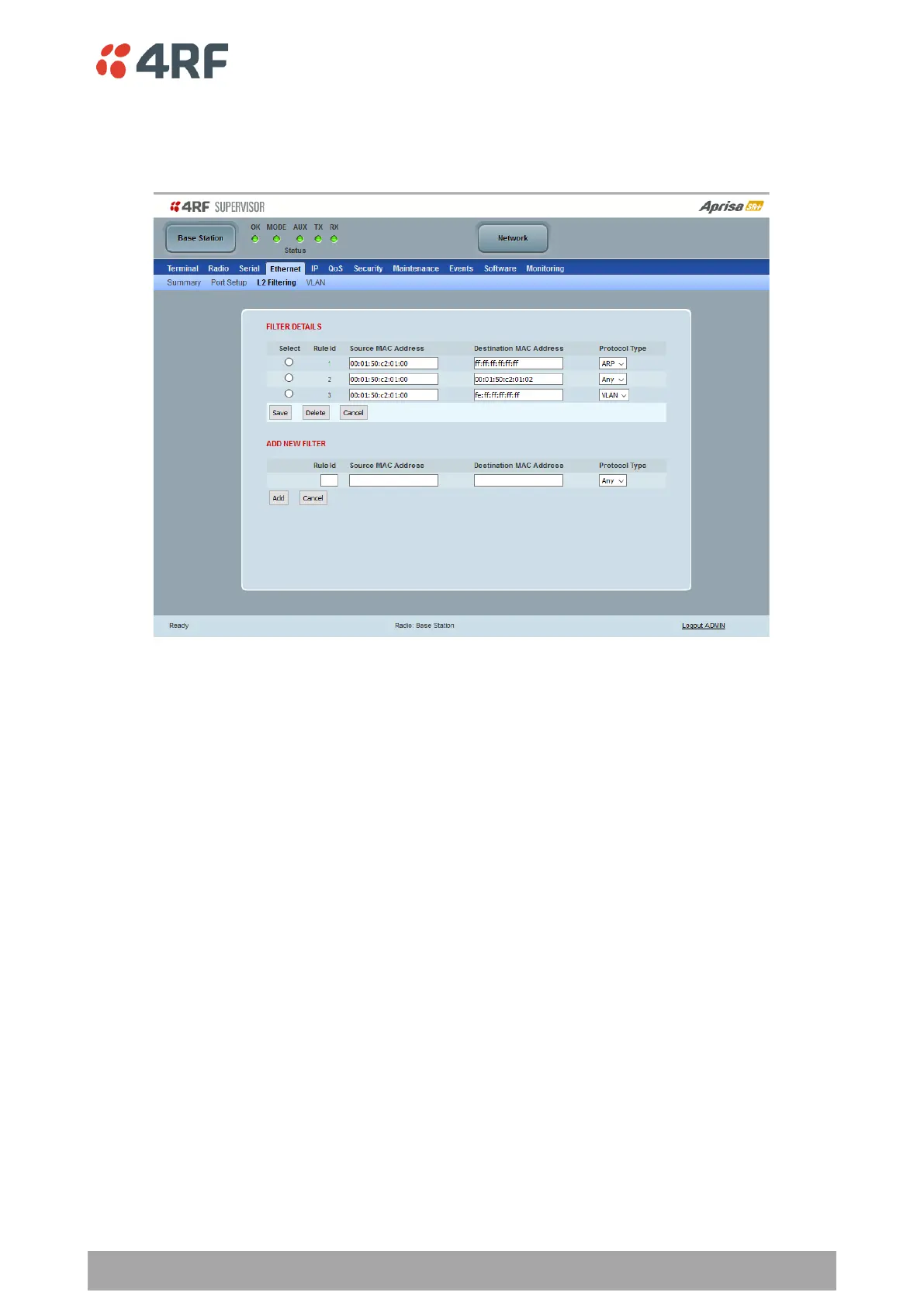 L2 Filtering provides the ability to filter (white list) radio link user traffic based on specified Layer 2 MAC