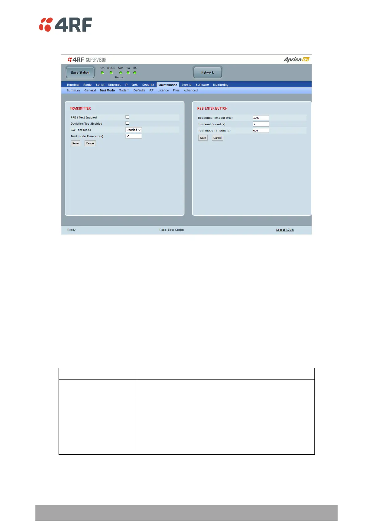 When active, the transmitter outputs a sideband tone at the deviation frequency used by the modem. This