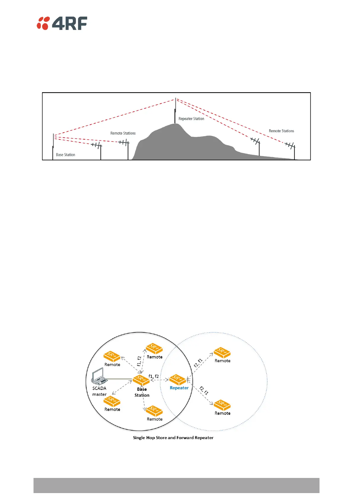 example depicts a repeater on the hill top to allow communication between the base station and the remote