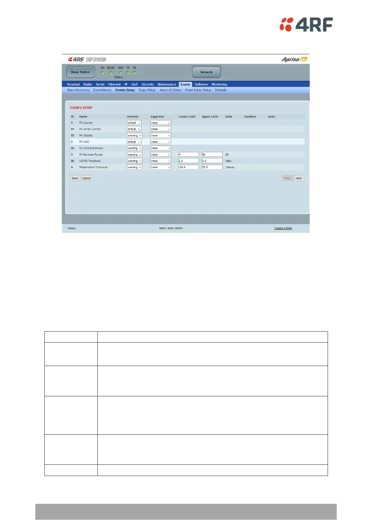 All active alarms for configured alarm events will be displayed on the Monitoring pages (see ‘Monitoring’ on