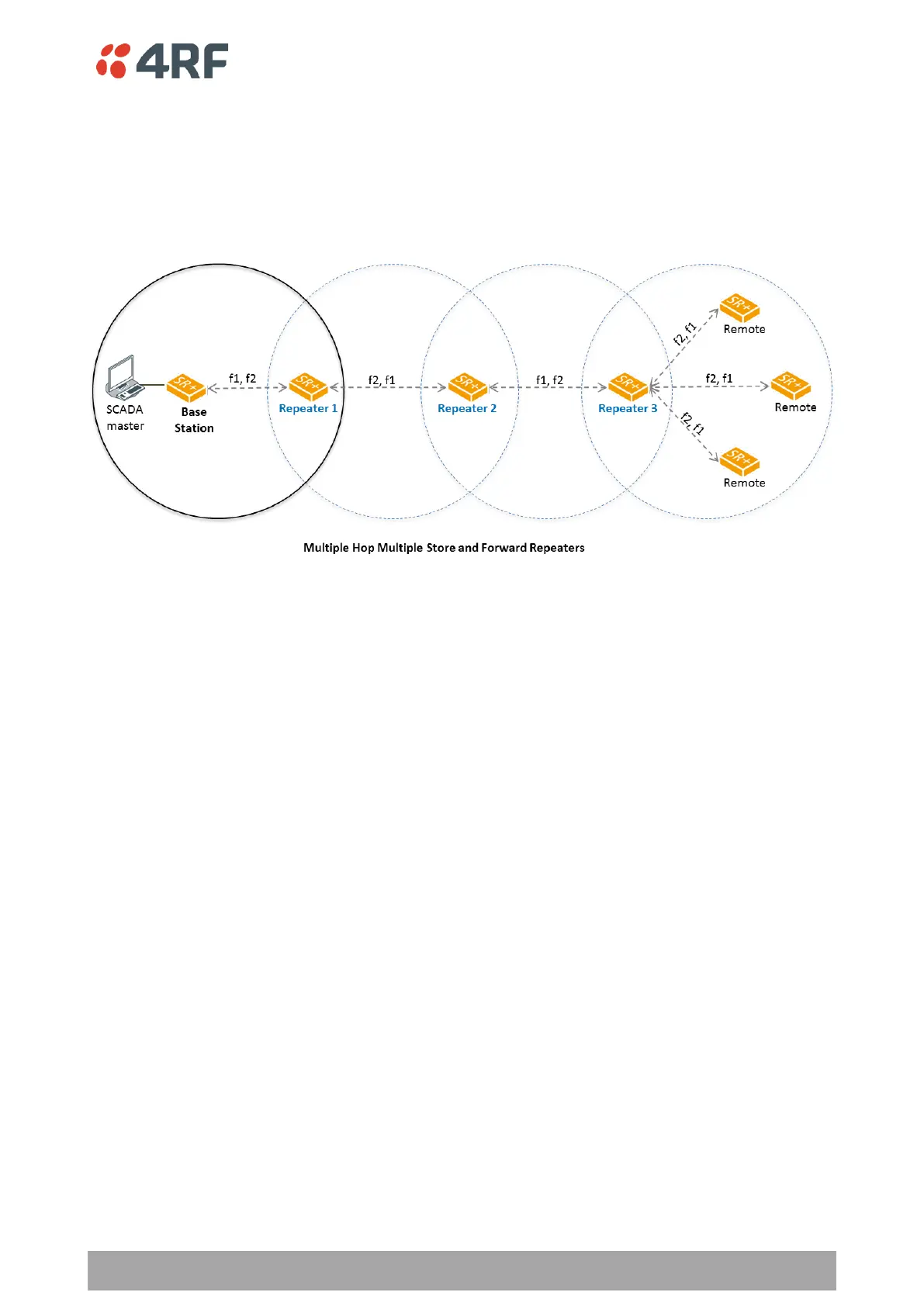example, the Base Station, Repeater 2 and remotes are deployed with Tx=f1 and Rx=f2. On the other hand