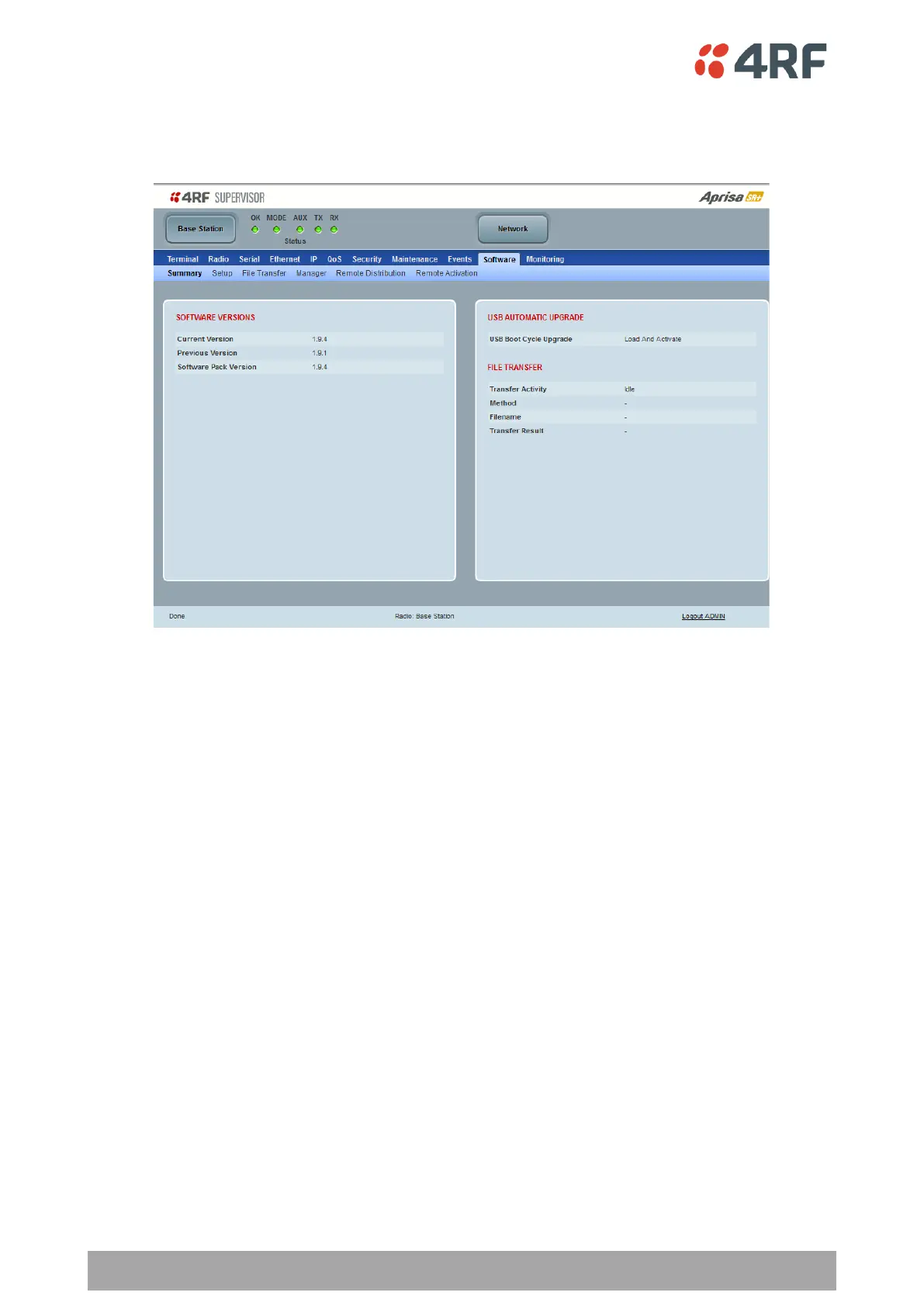 This page provides a summary of the software versions installed on the radio, the setup options and the