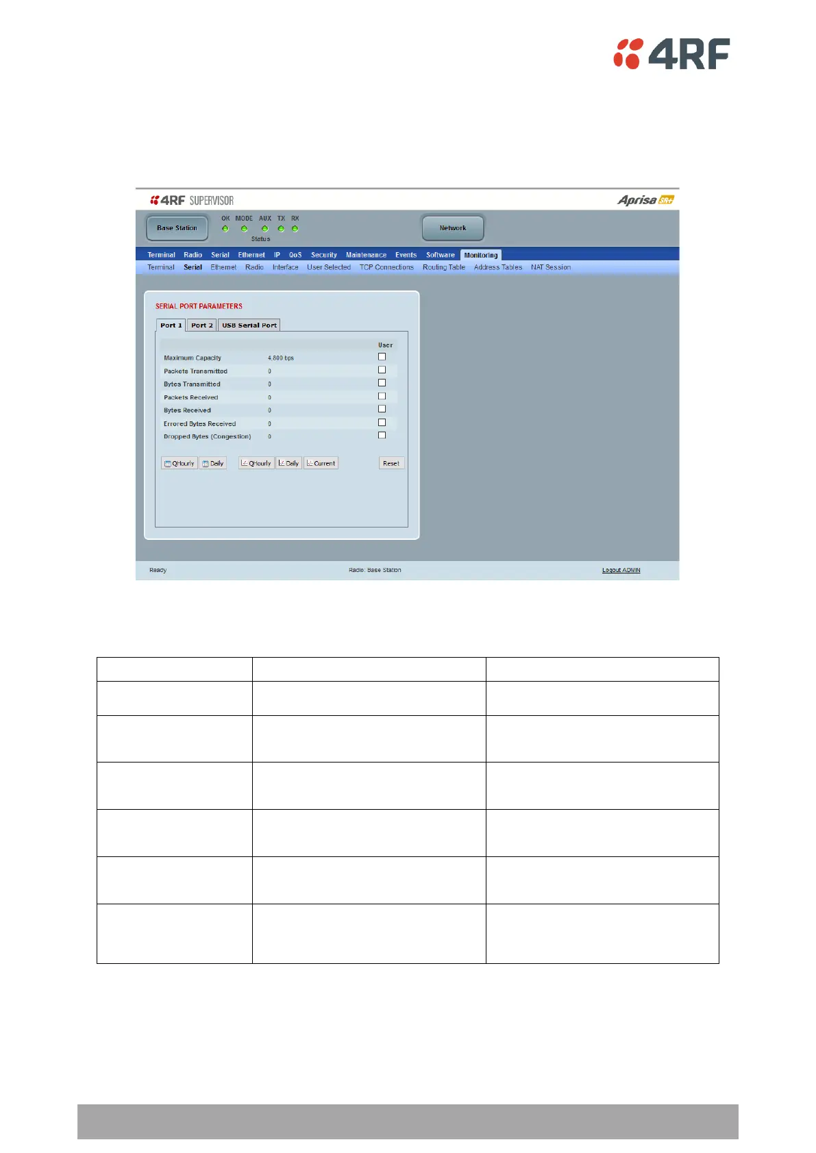 This page displays the current radio performance monitoring parameters per serial port in packet and byte