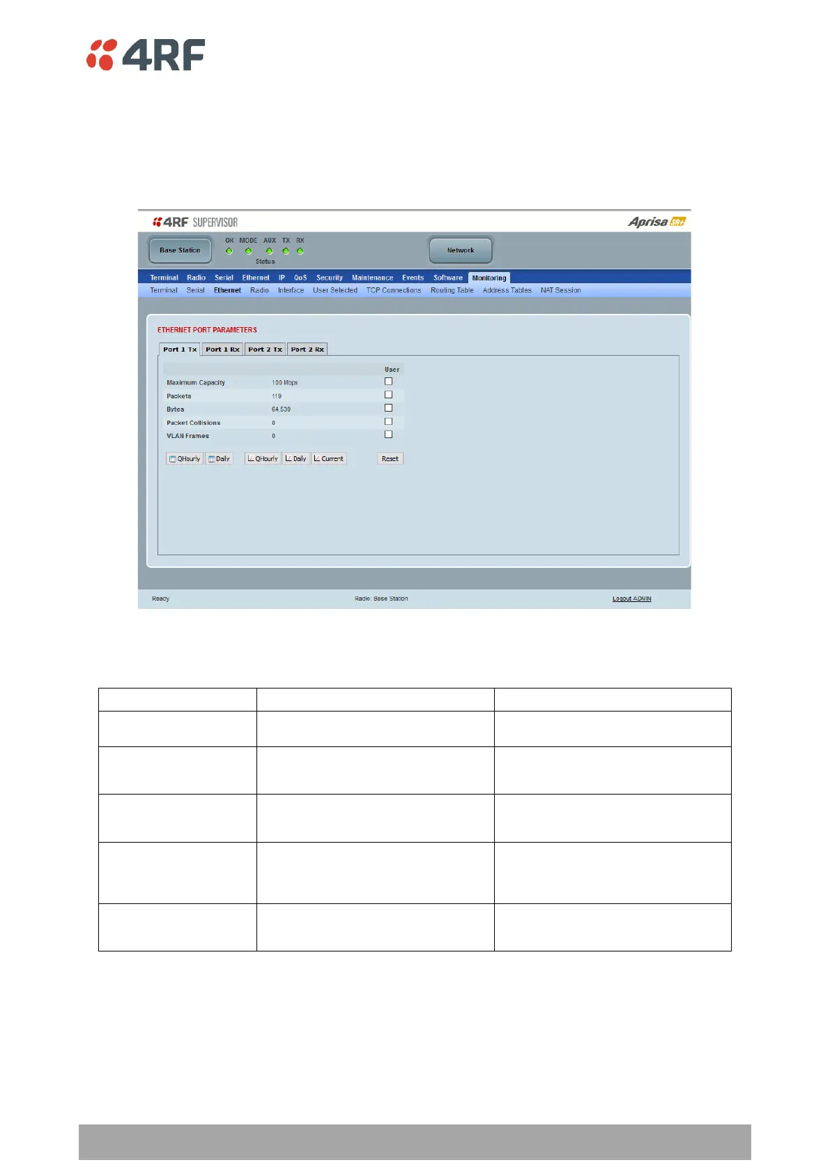 This page displays the current radio performance monitoring parameters per Ethernet port transmission (TX)