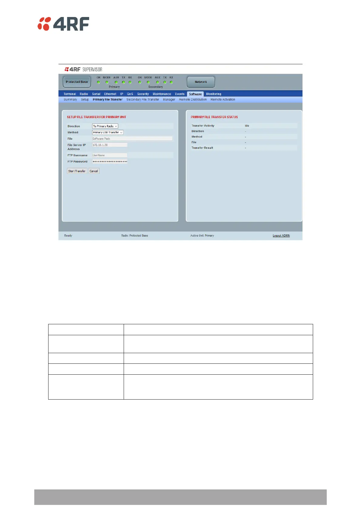 This page provides the mechanism to transfer new software from a file source into the primary radio.