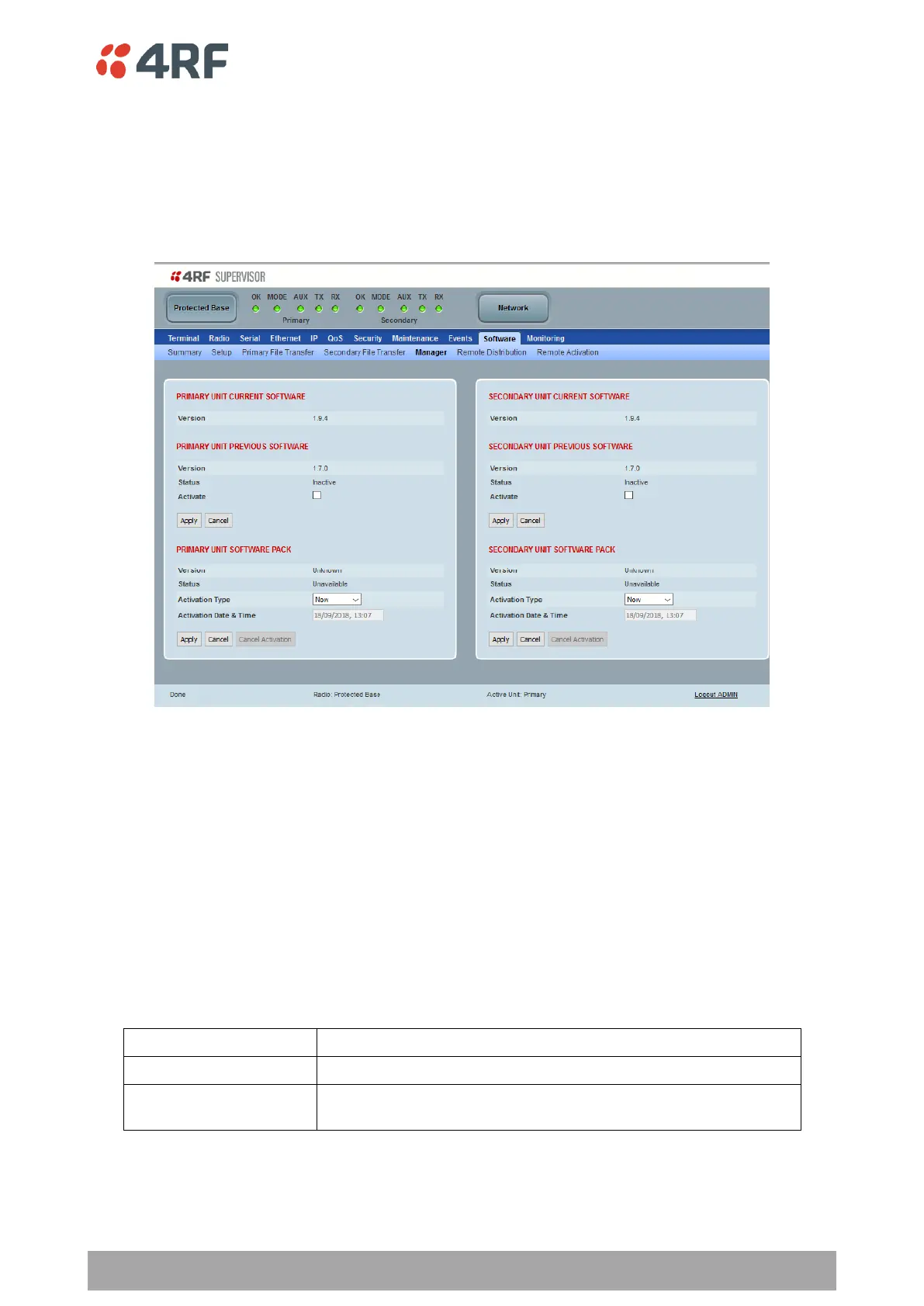 This page summaries and manages the software versions available in the primary and secondary radios.