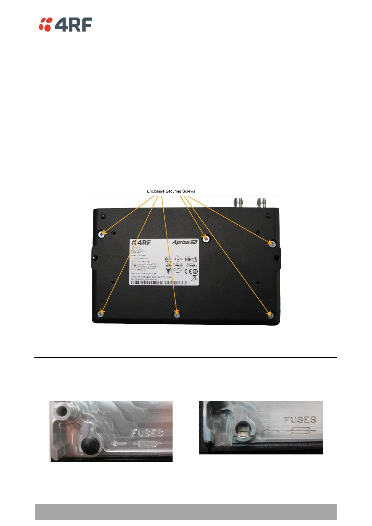 The Aprisa SR+ radio PBA contains two fuses in the power input with designators F1 and F2. Both the positive