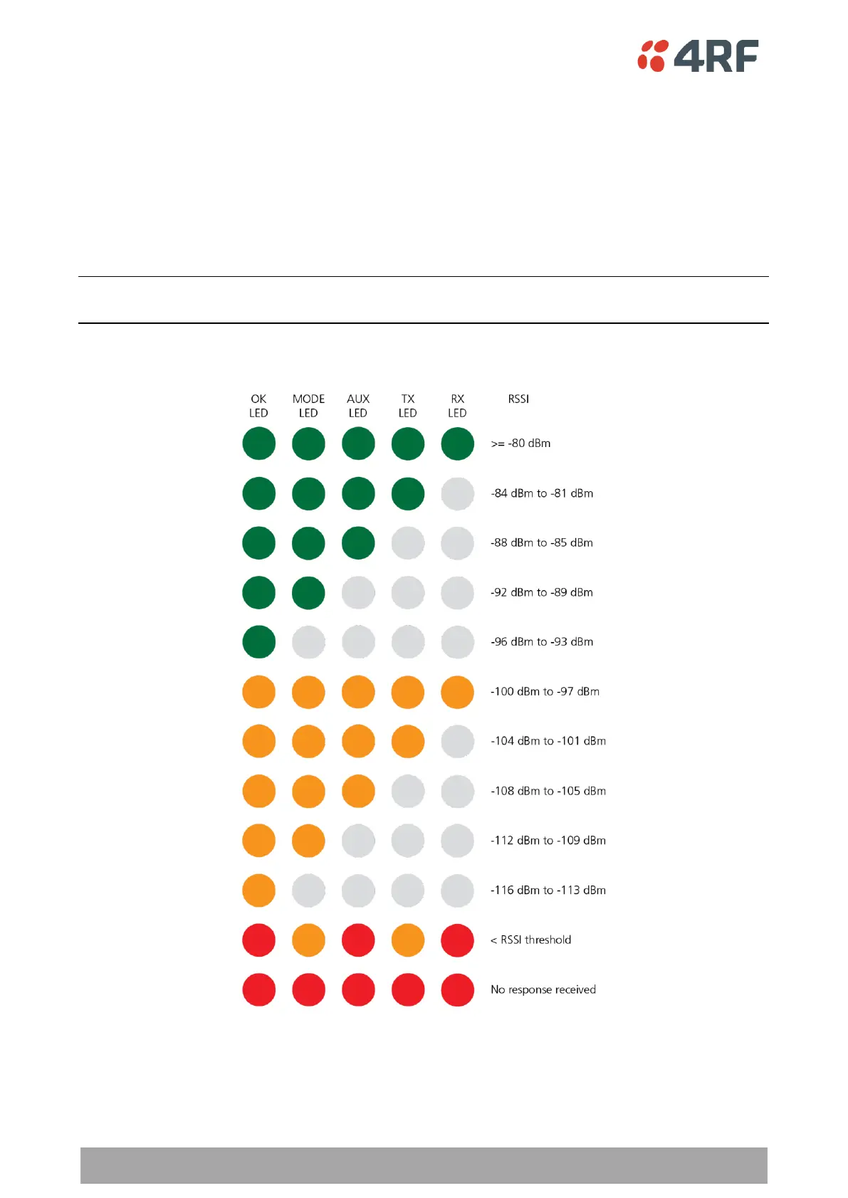 The RSSI result is displayed on the LED Display panel as a combination of LED states:
