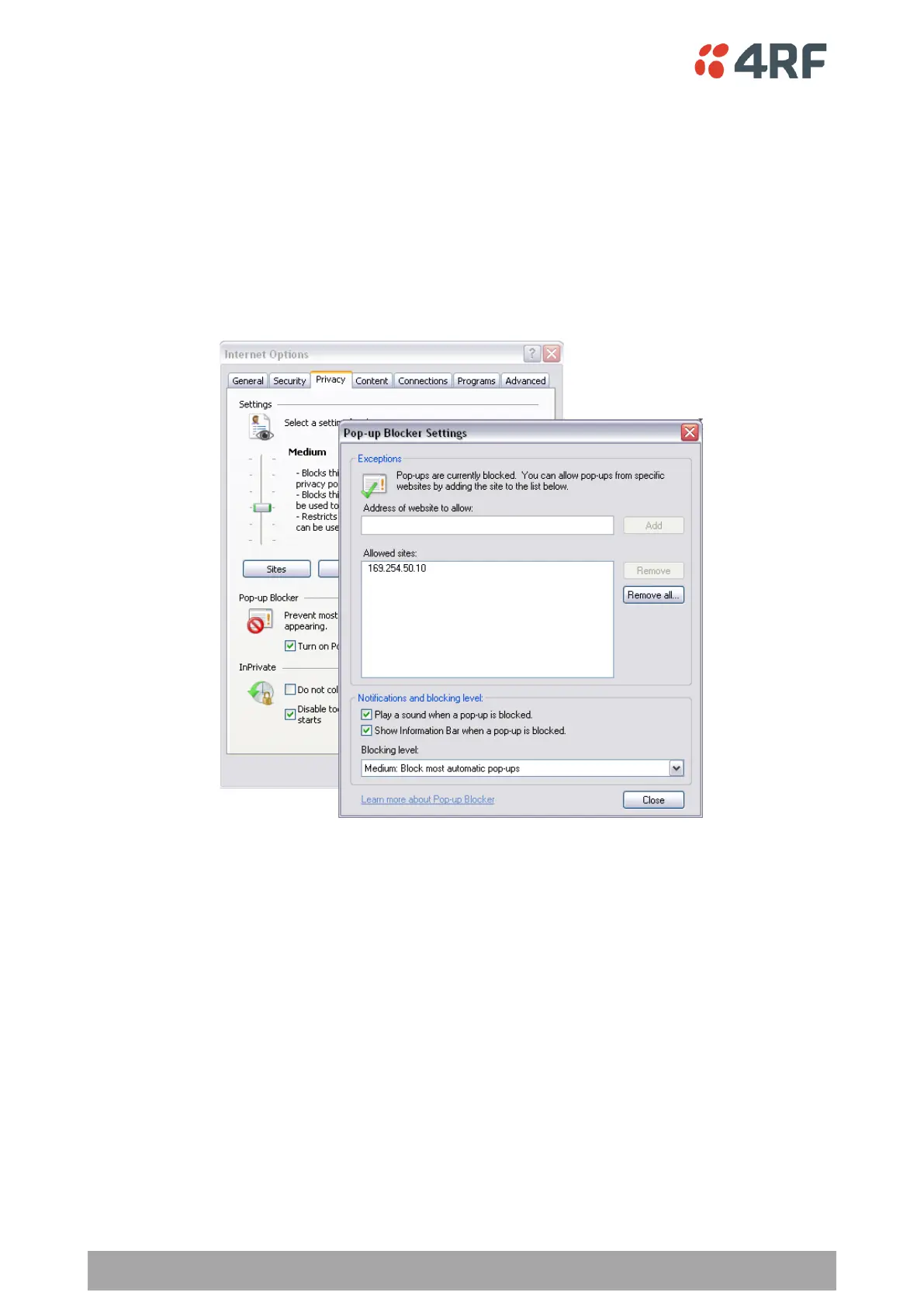 4. Set the ‘Address of Web site to allow’ to the radio address or set the ‘Blocking Level’ to ‘Low: Allow