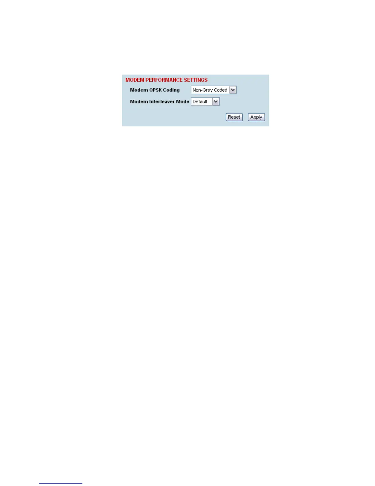 There are two Modem Performance Settings, Modem QPSK Coding and Modem Interleaver Mode.