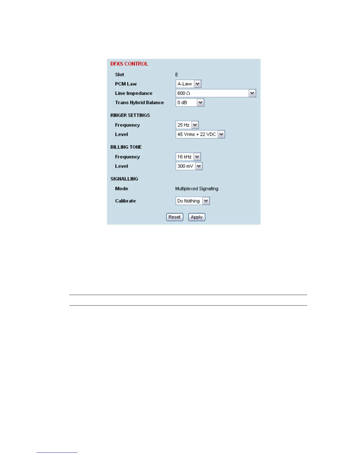 The DFXS Control page sets values for both ports on the DFXS card. The cards are shipped with