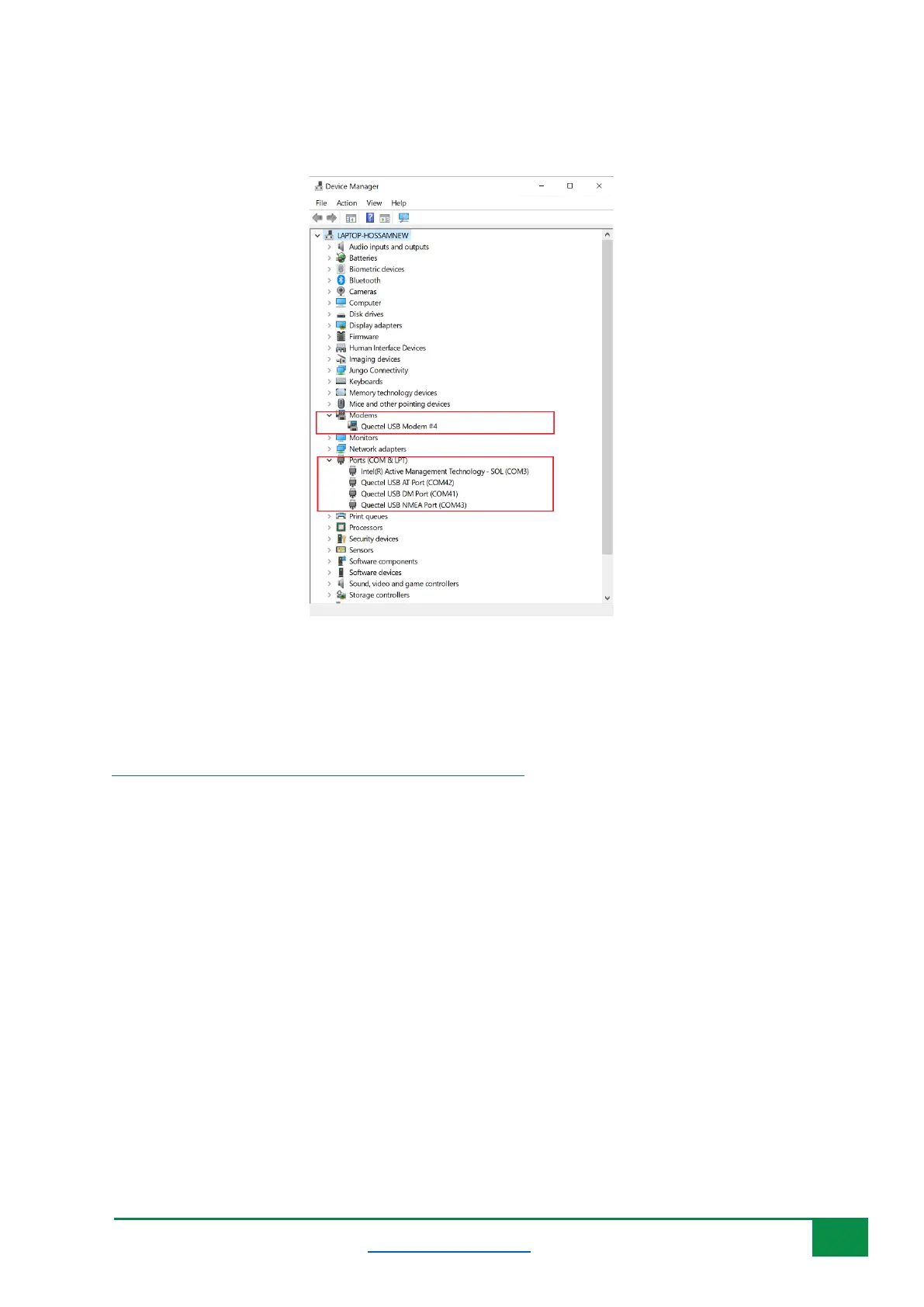 3- Connect the board to a USB cable to PC, then you shall see the ports and modem in the
