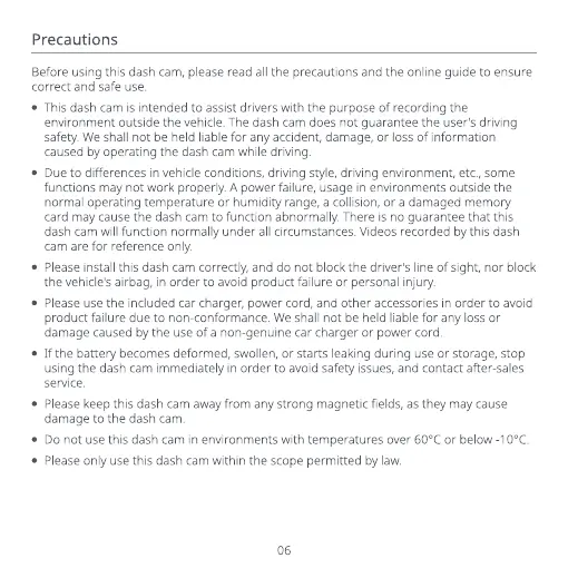 Before using this dash cam, please read all the precautions and the online guide to ensure