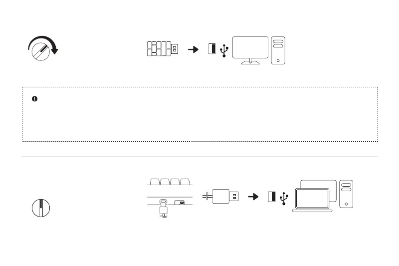 1. 将 模式开关 移动到 2.4 位置。 2. 将配备的 2.4G 接收器 连接到设备的 USB 端口; 连接完成后,连接指示灯 常亮 8 秒后熄灭。