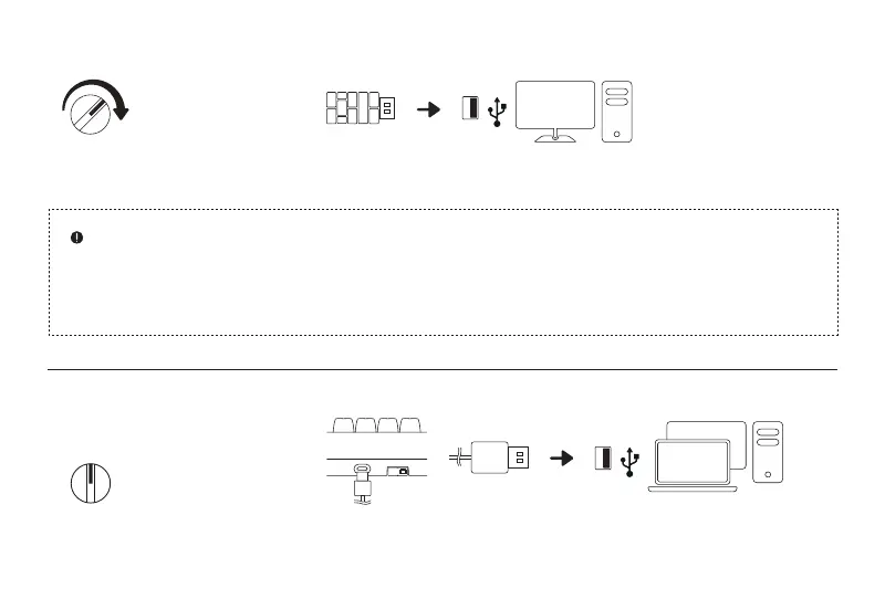 1. モードスイッチを2.4の位置に 合 わせます。 2. 搭載されている2.4GレシーバーをデバイスのUSBポートに接続します。接続が完了すると、