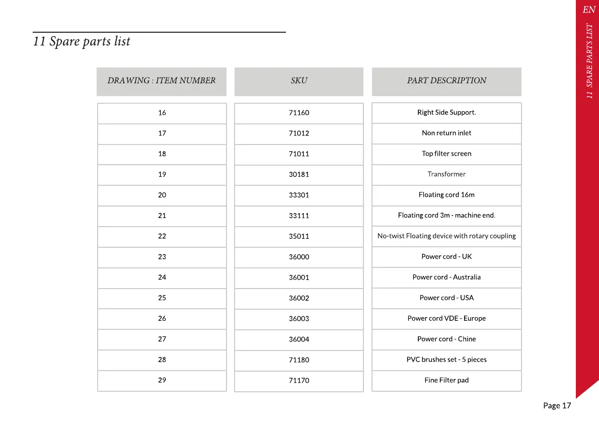 11 Spare parts list