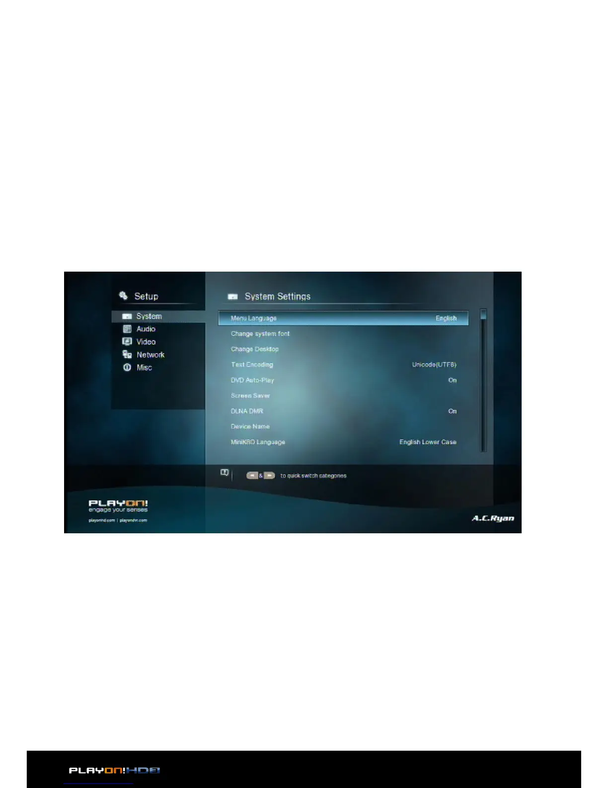 mote control. There are five setup options, including System, Audio, Video, Network