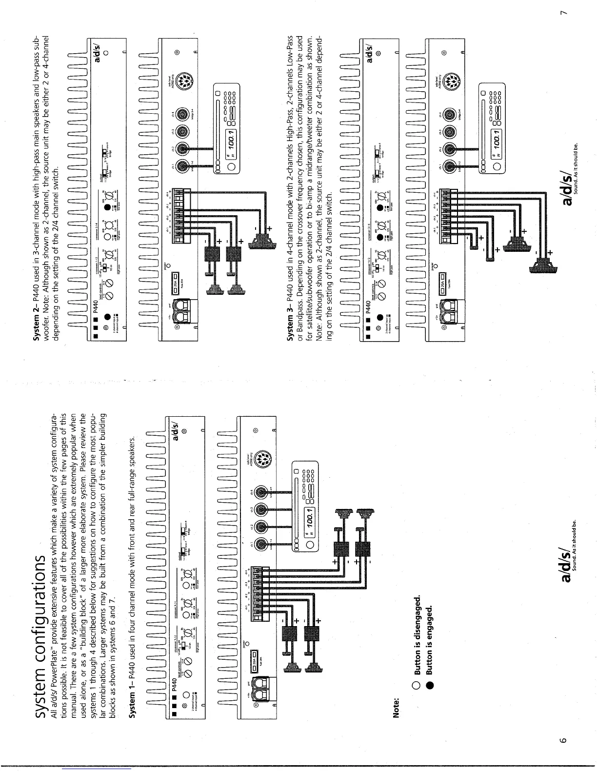 a/d/s/ P440 - System Configurations; System 1: Four-Channel Full-Range; System 2: Three-Channel (High-Pass;Low-Pass); System 3: Four-Channel (Bi-Amp;Subwoofer)
