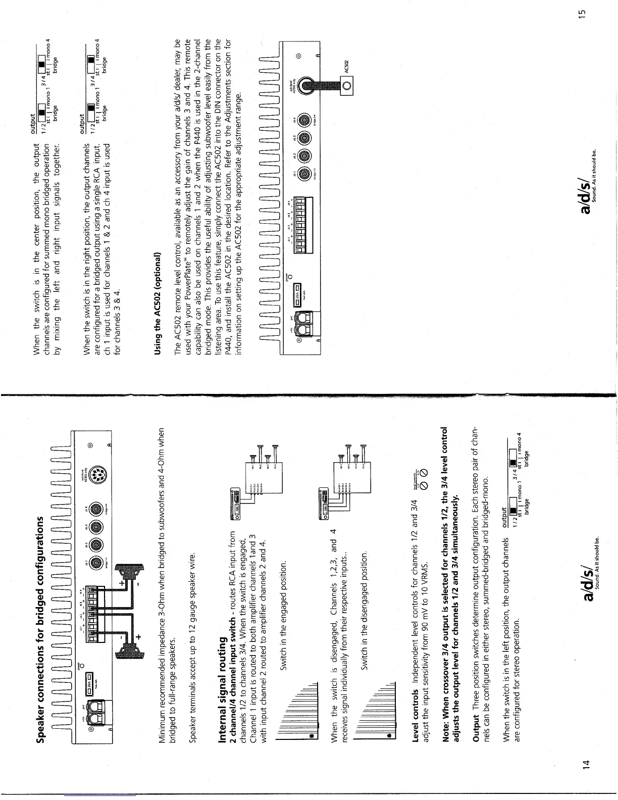 a/d/s/ P440 - Bridged Speaker Connections; Internal Signal Routing; Level Controls; Output Configuration