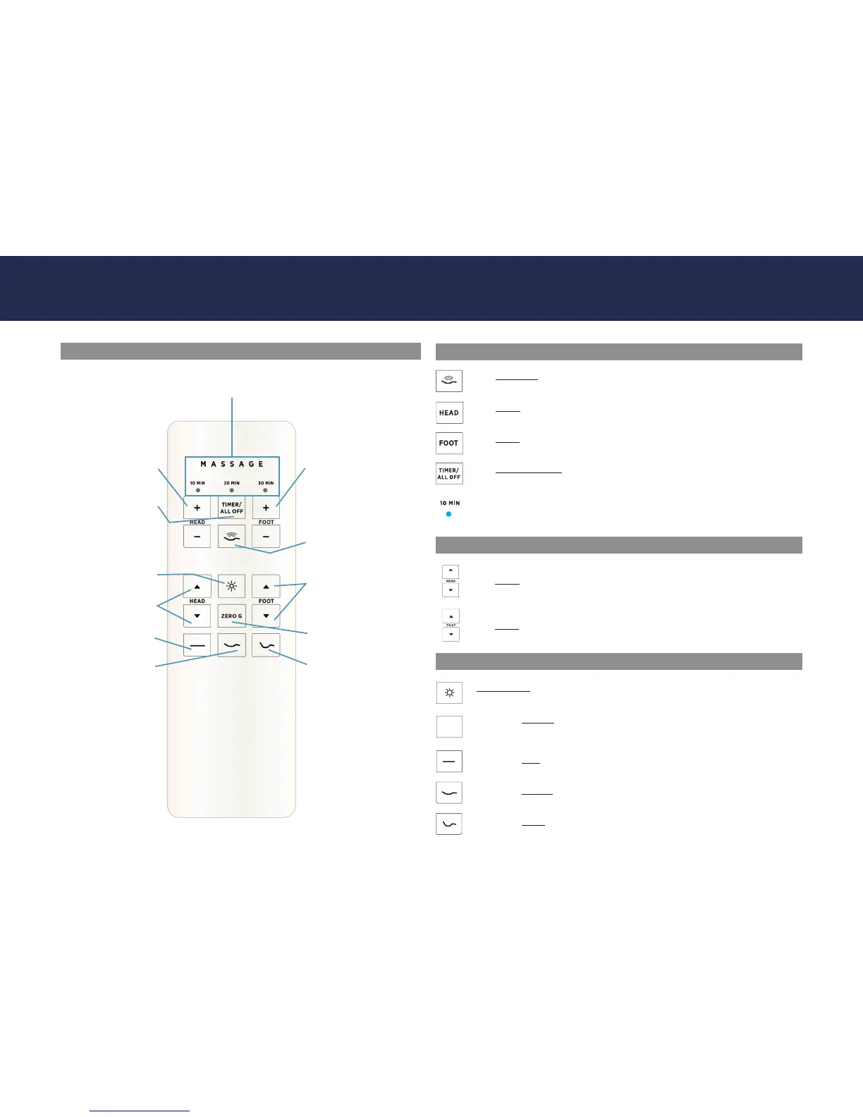 The TIMER/ALL OFF button Starts massage at level 3. Select a 10, 20 or 30