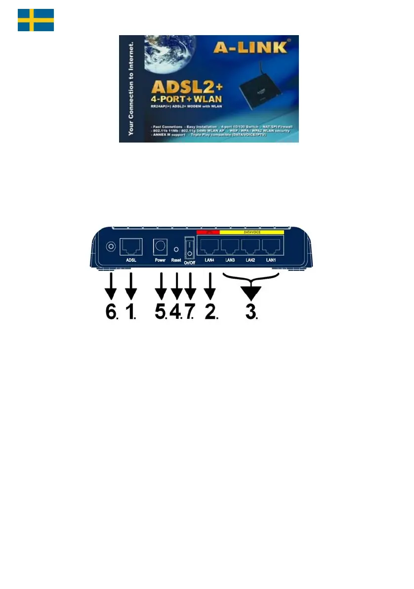 1. Ansluta telefon kabeln från ADSL-linjen till modemets ADSL-porten.