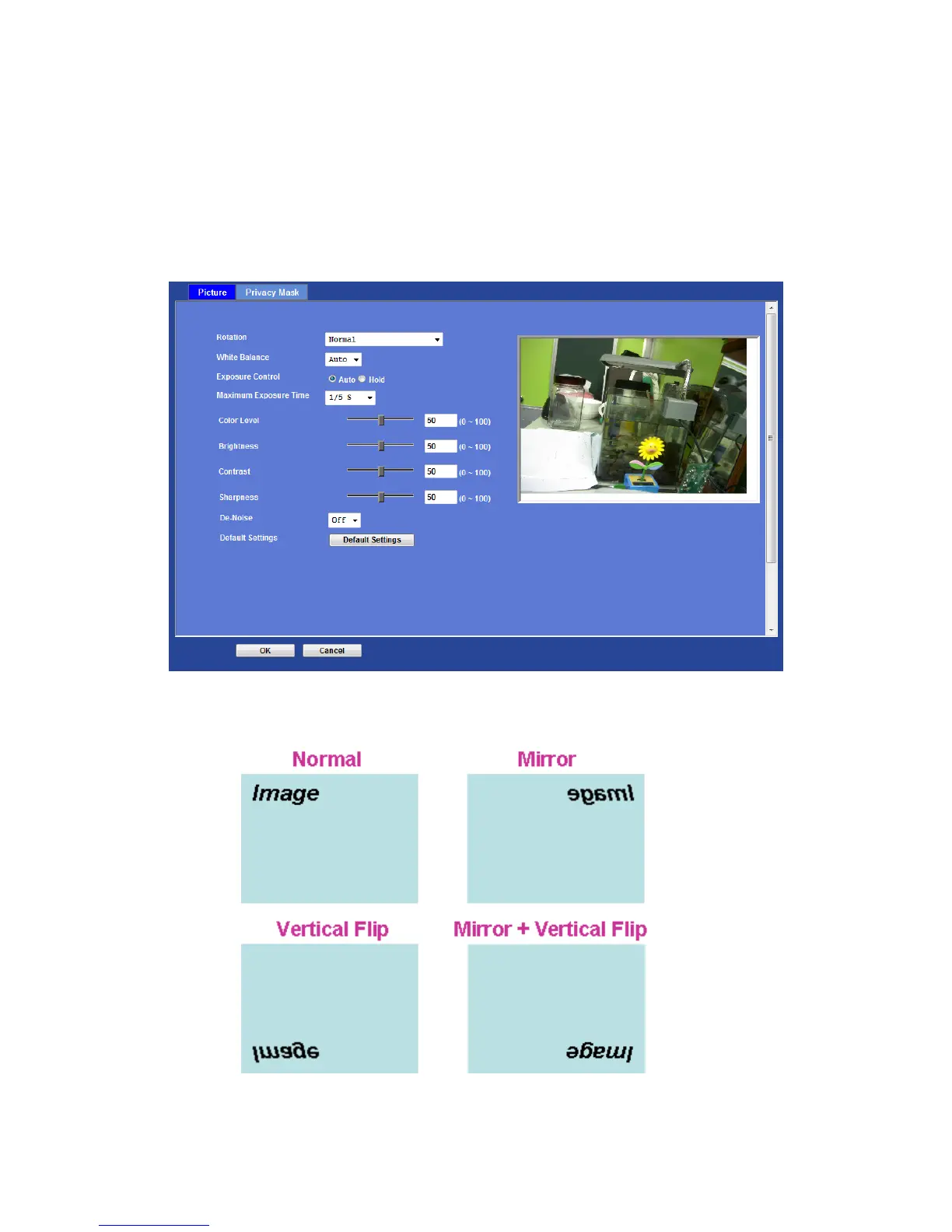 Turn the “Mirror” and “Vertical Flip” On or OFF. The image will be overturned as below.