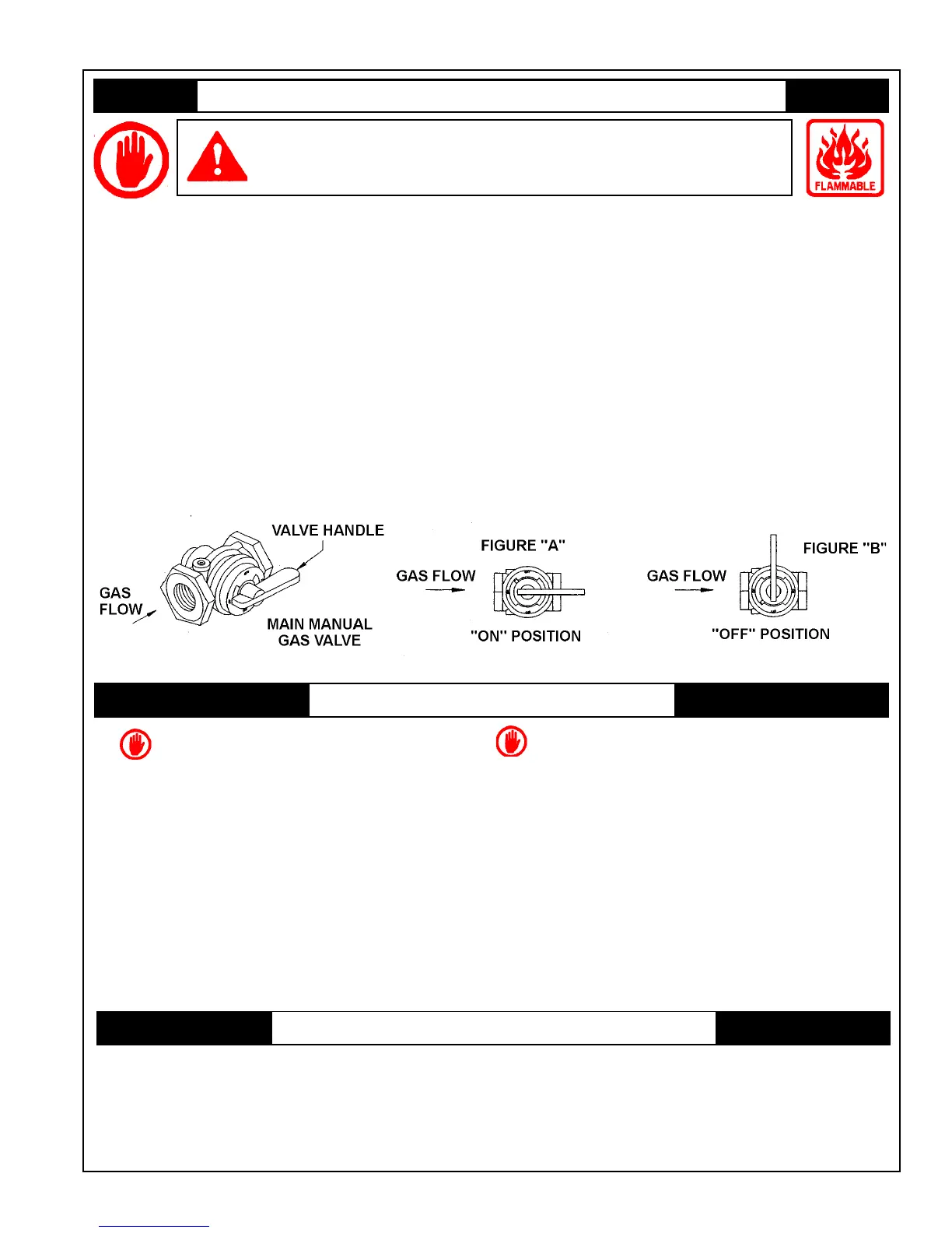 3. TURN MAIN MANUAL GAS VALVE TO “OFF” POSITION, (FIGURE “B”). THE VALVE