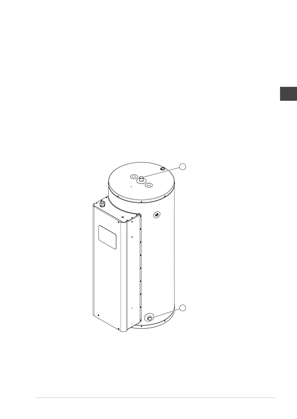 Koud water stroomt via de waterinlaat (2) de tank binnen. Het verwarmde water verlaat