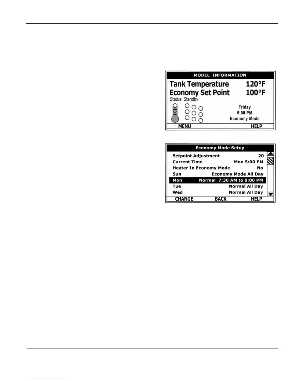 Seven daily sub menus are listed at the bottom of the Economy Mode Setup menu. There