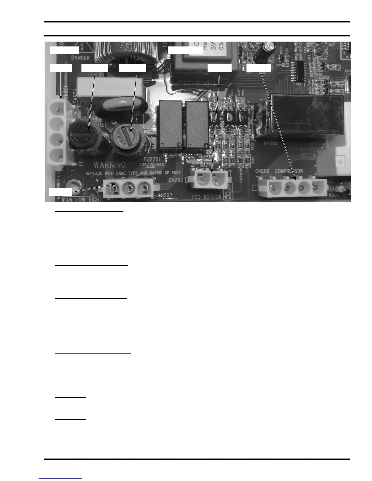 • Fuse 201 (3 Amp, 250V, slow blow) fuses the L1 power leg coming to the Control Board