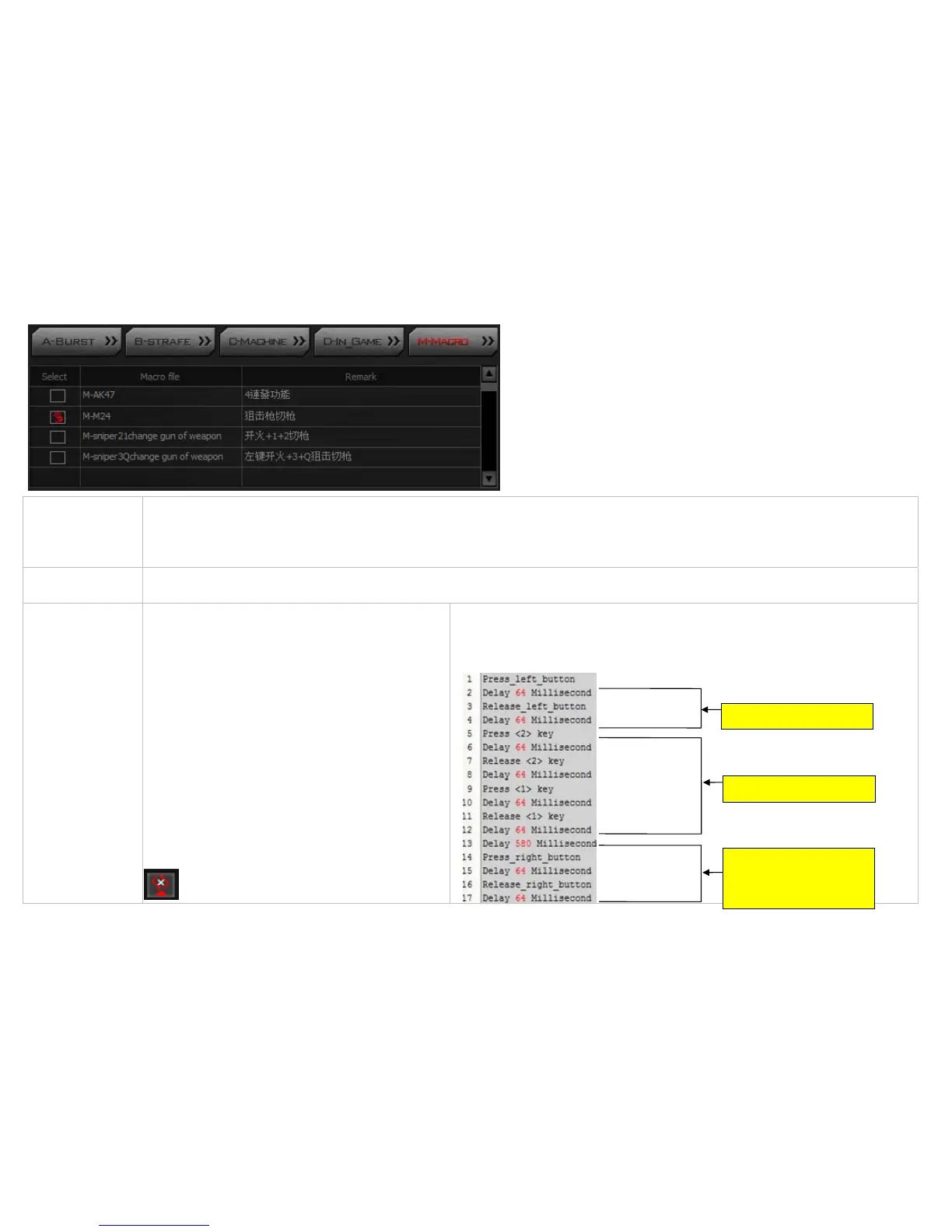 Via Oscar Macro editing, [M-Macro] can be programed and assigned to the mouse left button. It is suitable to incorporate serious of actions after you snipe