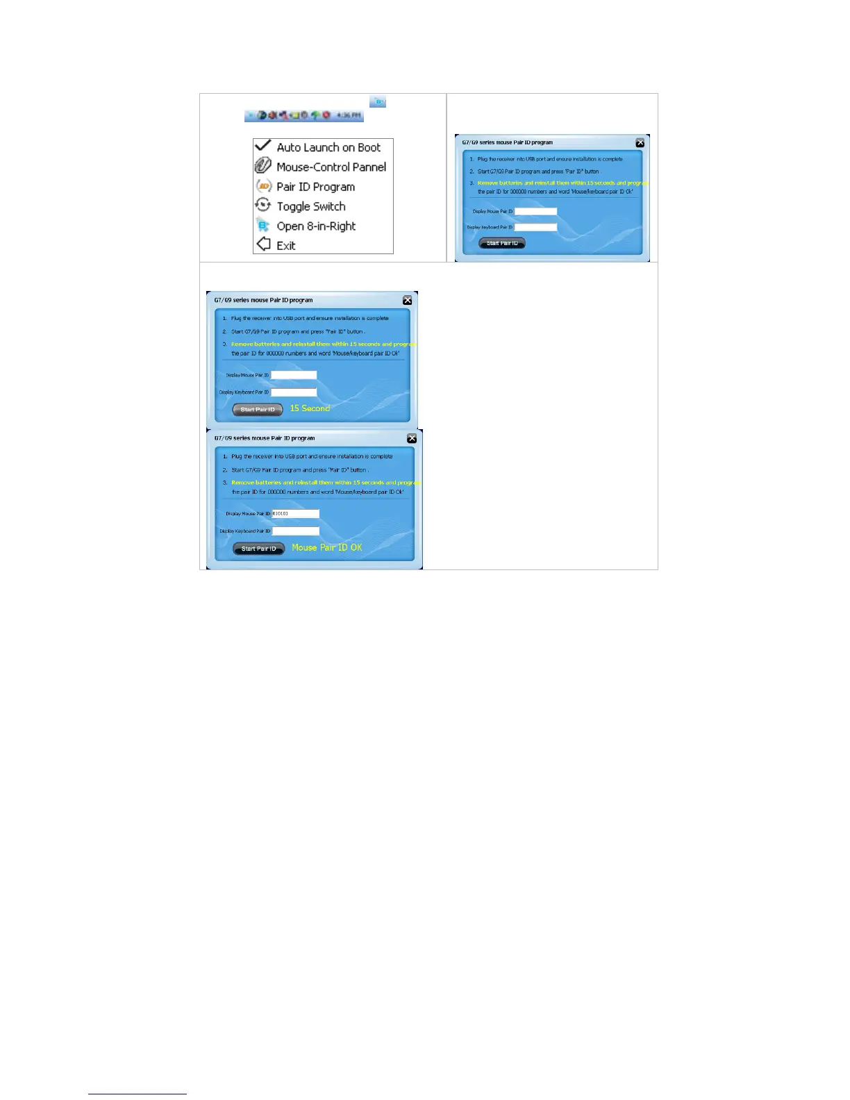 matching code will be displayed on the menu as shown “Mouse Pair ID OK”.