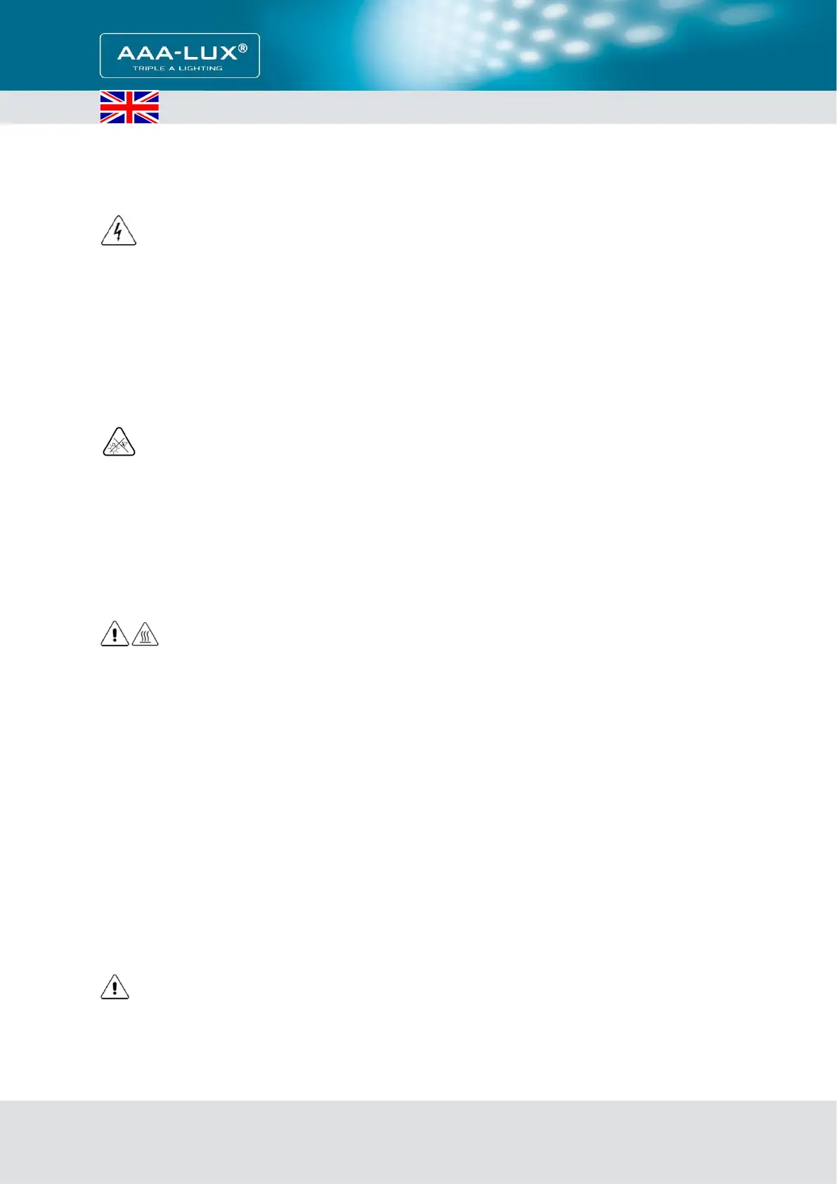 electrical codes and the instructions provided by AAA-LUX. AAA-LUX components can be under dangerously high voltage. This