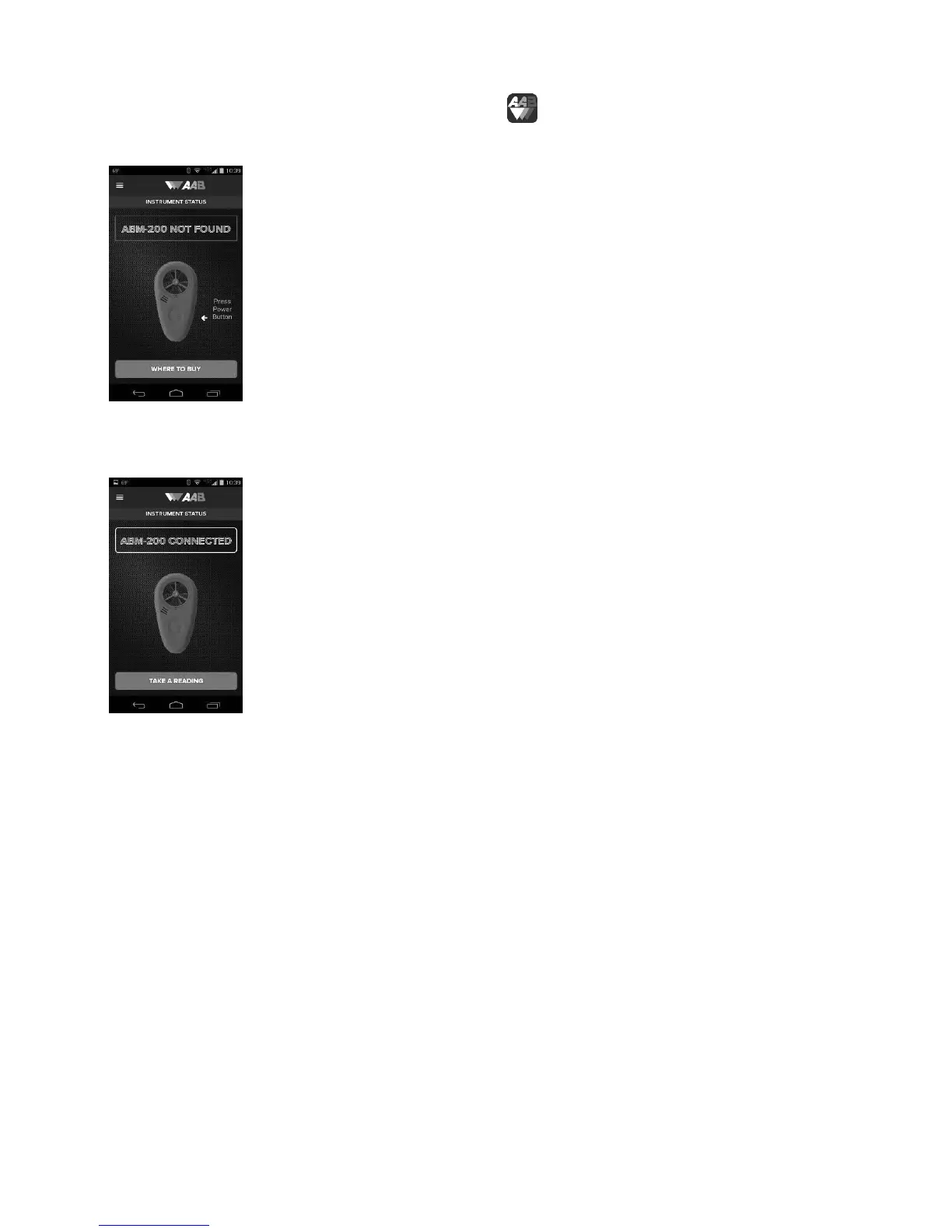 On the ABM-200, press the power button marked with the AAB logo. The app screen