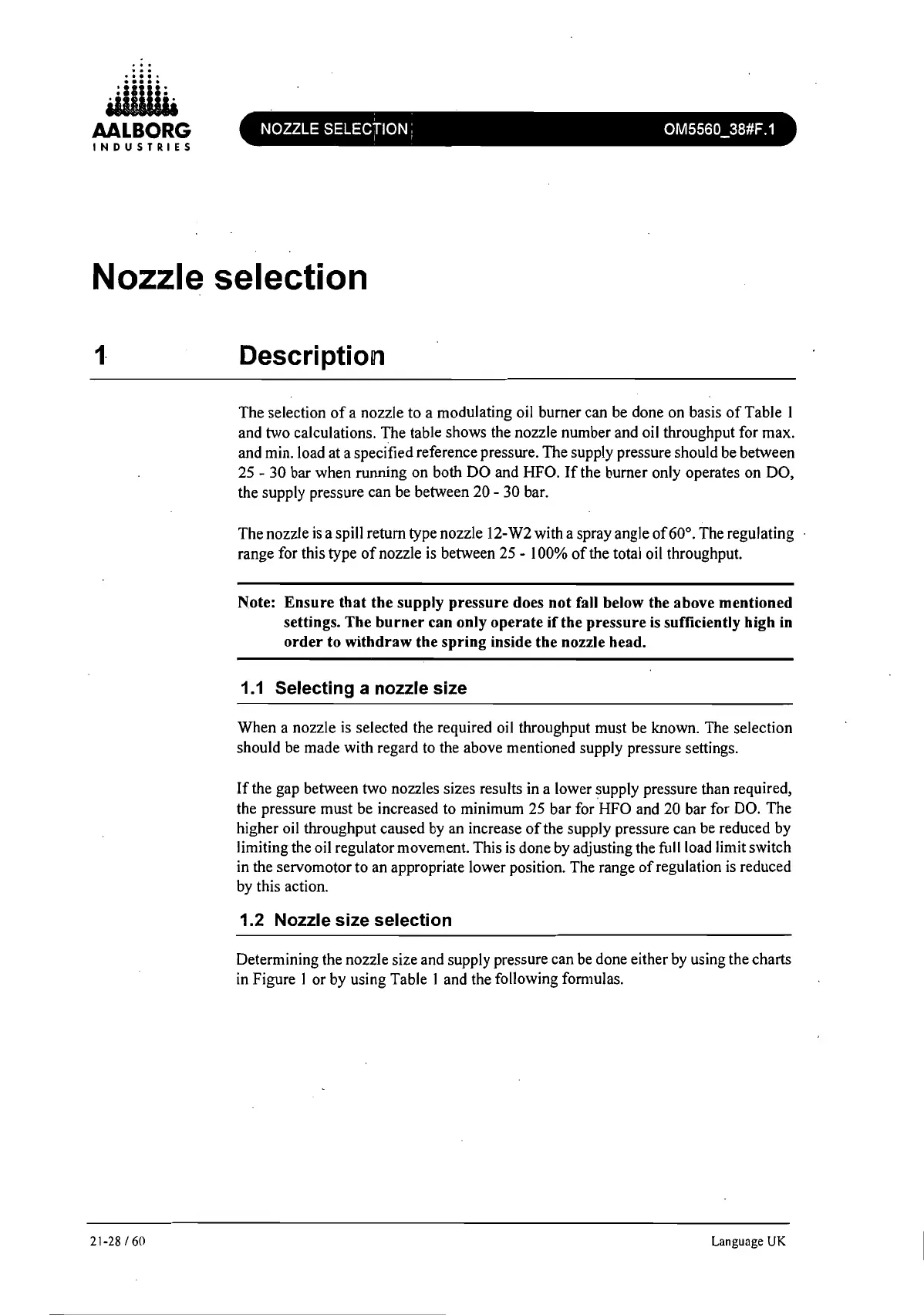 and two calculations. The table shows the nozzle number and oil throughput for max.