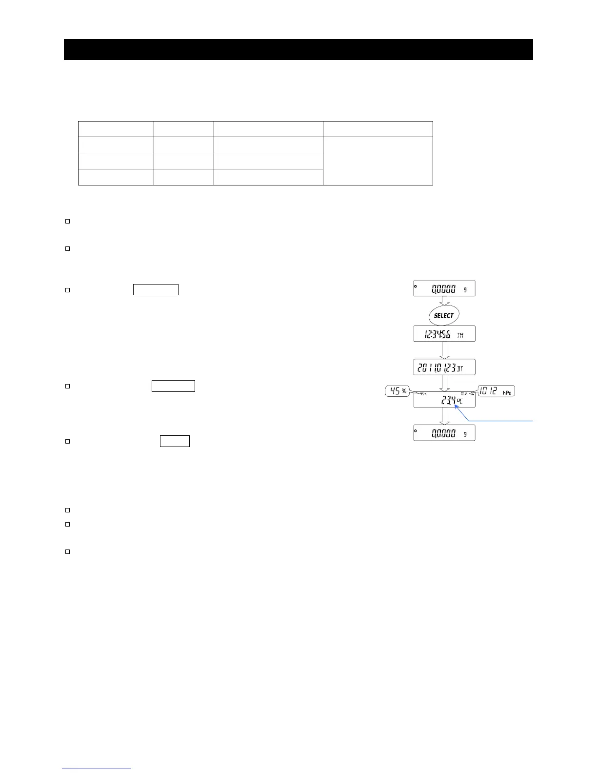 In the weighing mode, the built-in clock and environmental sensors (temperature, humidity, air