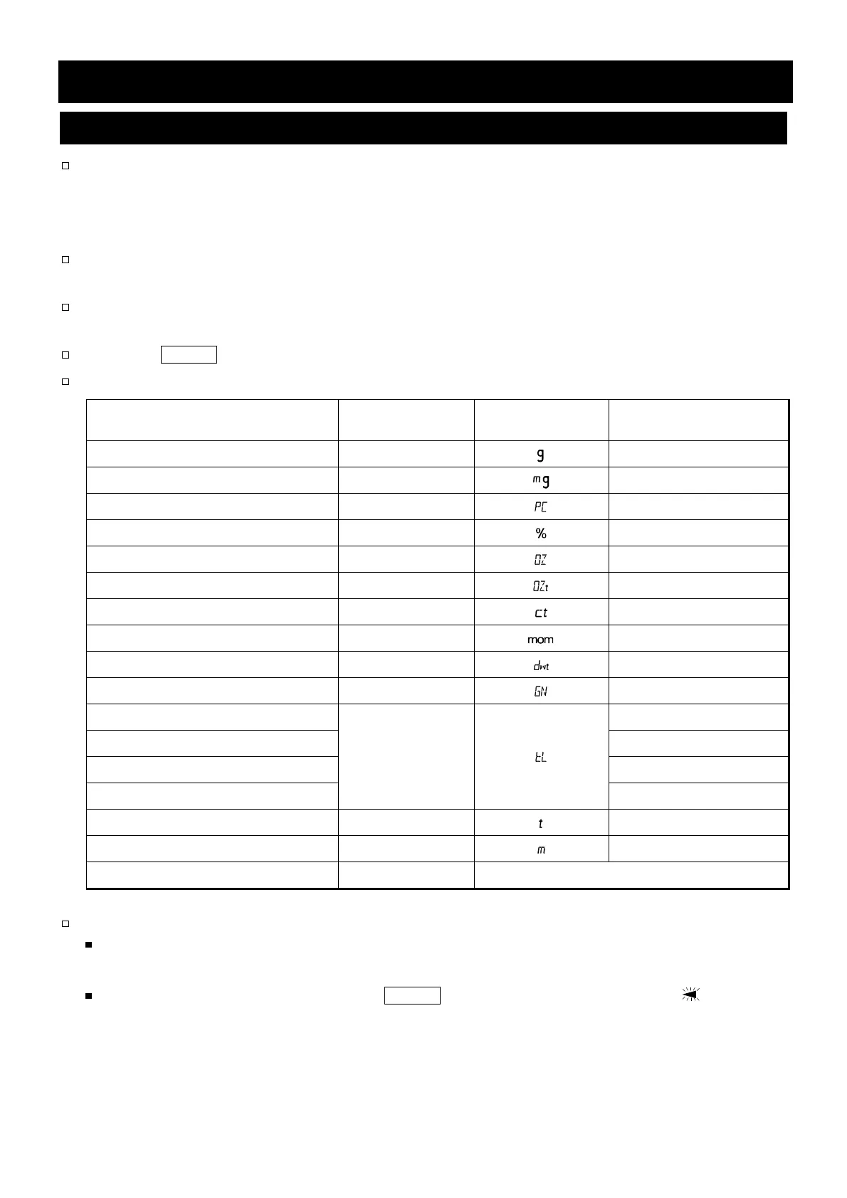 The units and weighing modes can be selected and stored in the function table as described in