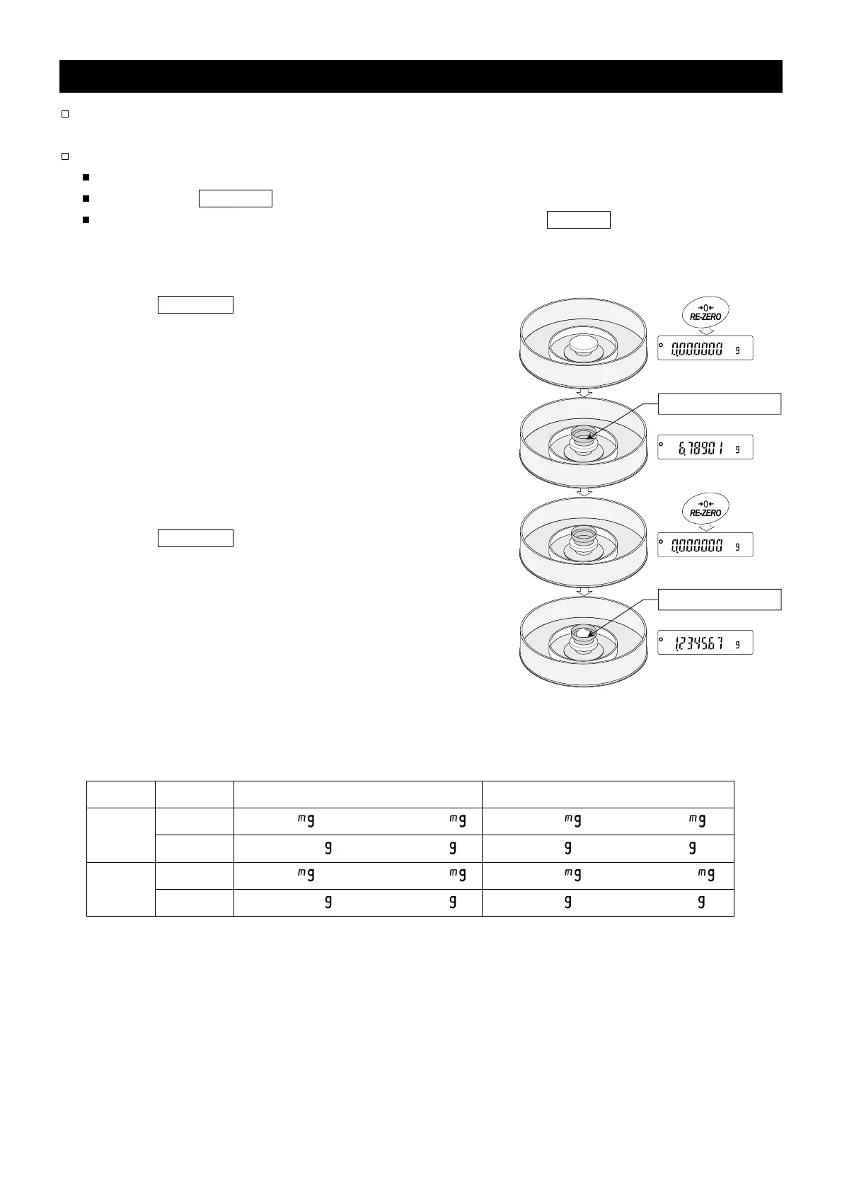 Pressing the RE-ZERO key allows weighing in the precision range, regardless of the tare value.