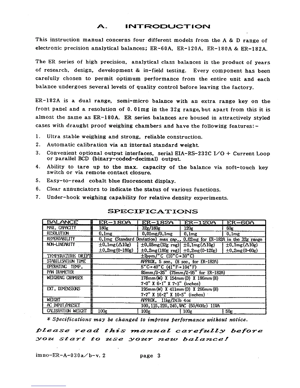 A&D ER-120A - Introduction and Specifications; ER Series Balances Overview; Key Features and Technical Specifications
