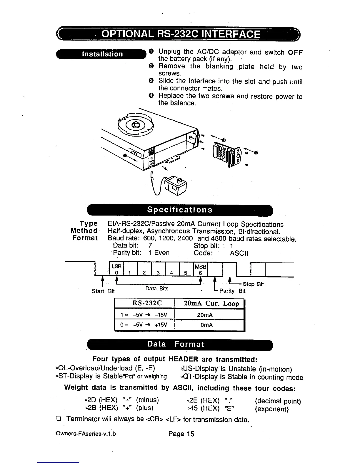 A&D FA-2000 - Optional RS-232 C Interface; Installation; Specifications; Data Format