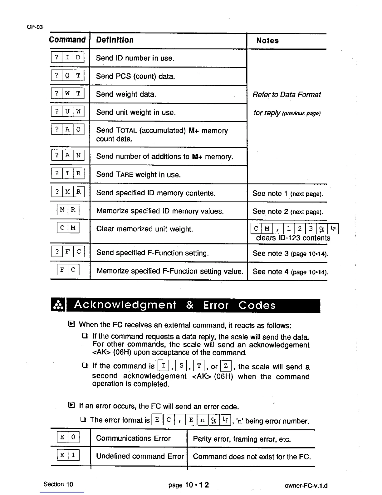 A&D FC-500 - Acknowledgment & Error Codes