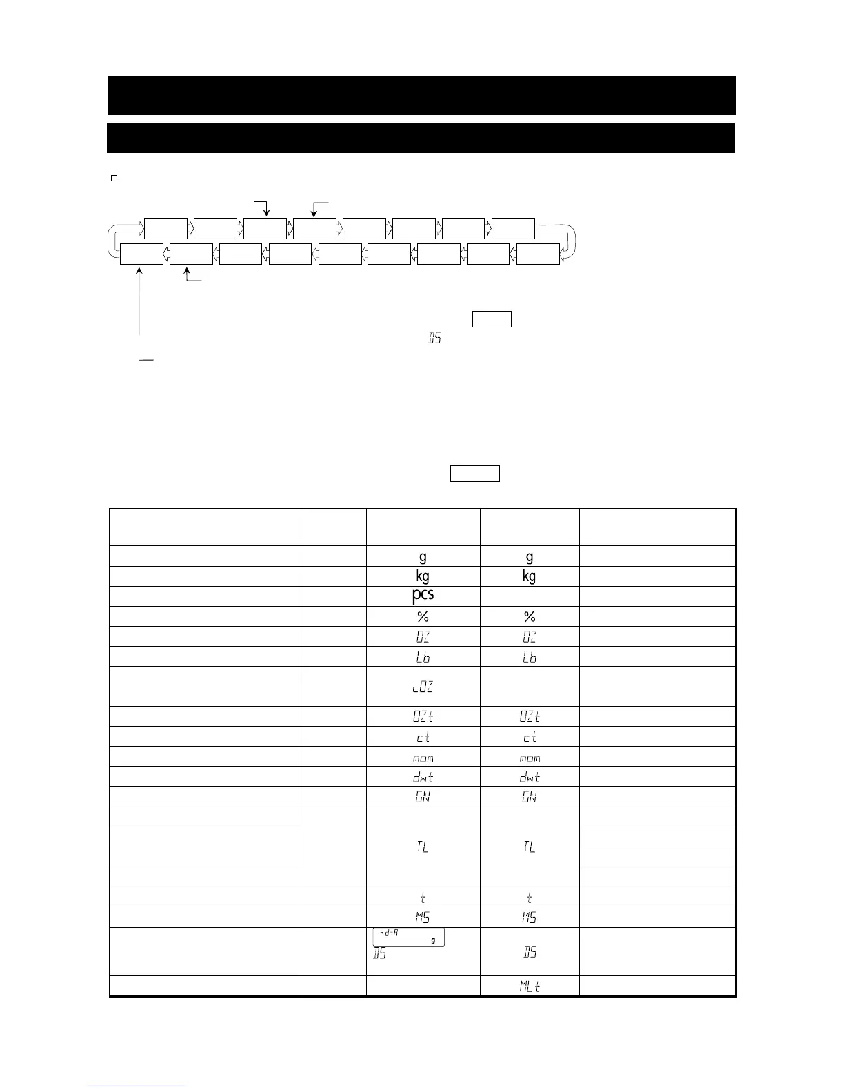 If a weighing mode (or unit of weight) has been turned off, that mode or unit will be missing in