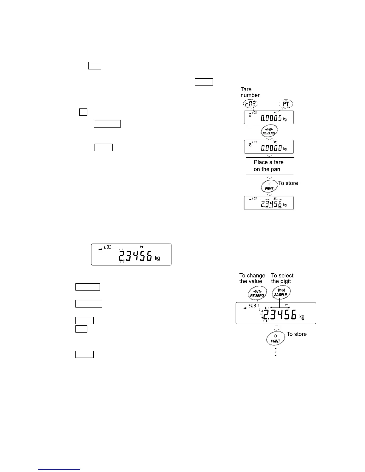 In the weighing input mode, a sample tare container is placed on the pan to store the tare value.