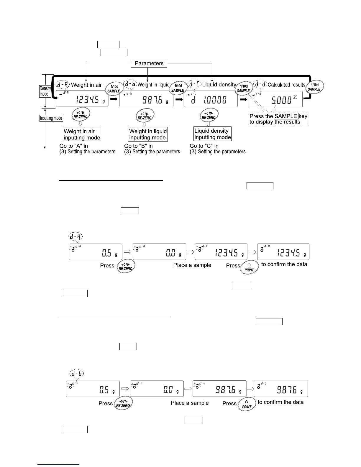 stable, press the PRINT key. The sample weight in liquid is confirmed and the balance will