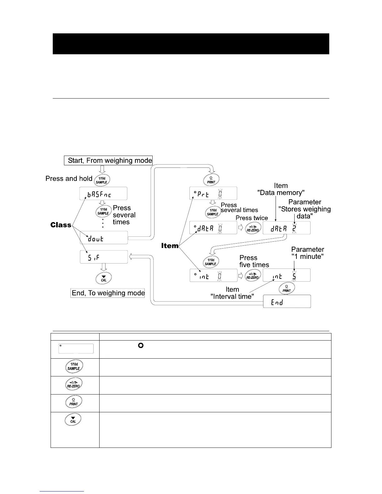 This example sets “Stores weighing data” for “Data memory” and “1 minute” for “Interval time”.