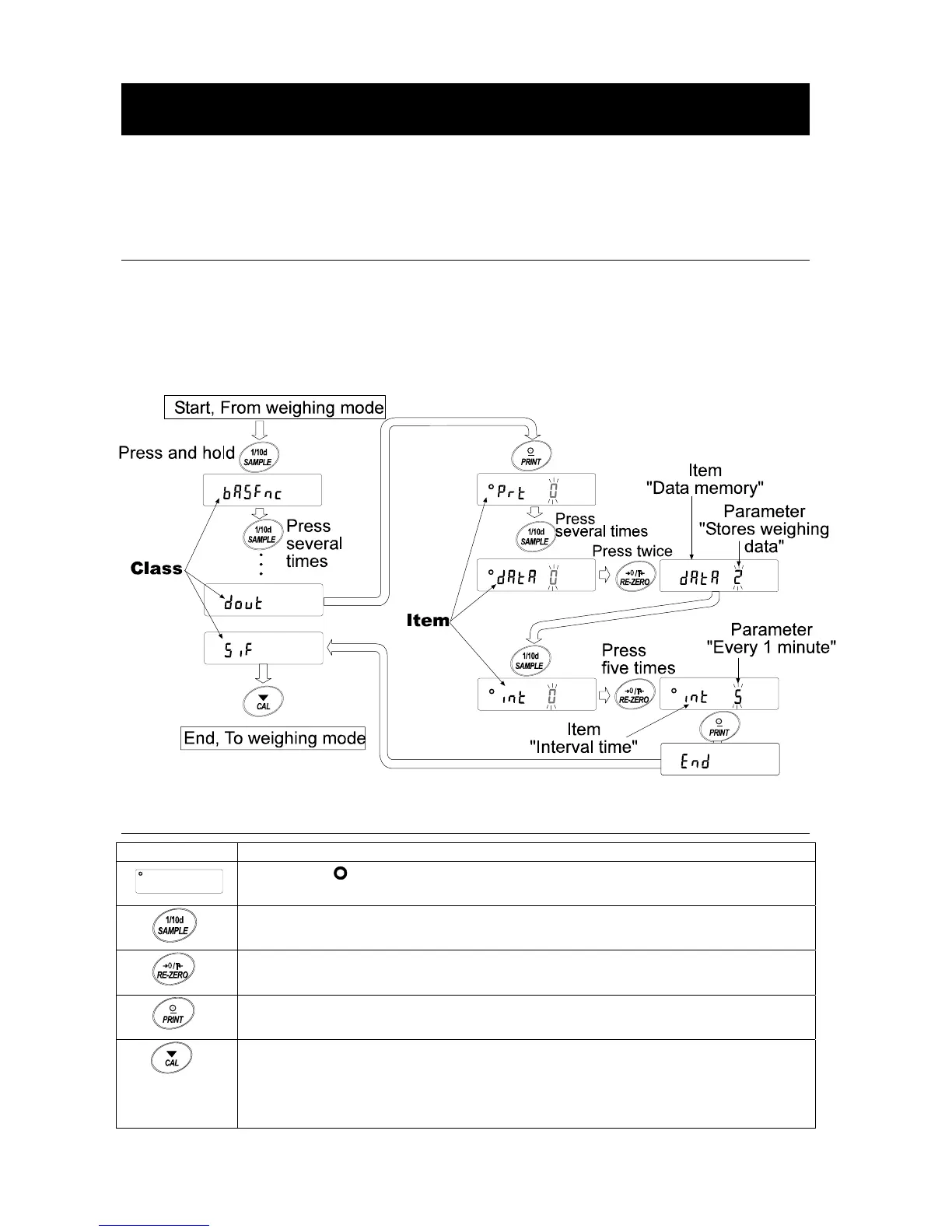 The function table reads or rewrites the parameters that are stored in the balance. These parameters
