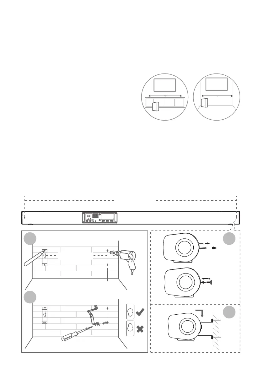 2. Firmly x 1 dowel into each hole in the wall if necessary. Tighten the wall mount brackets on the wall