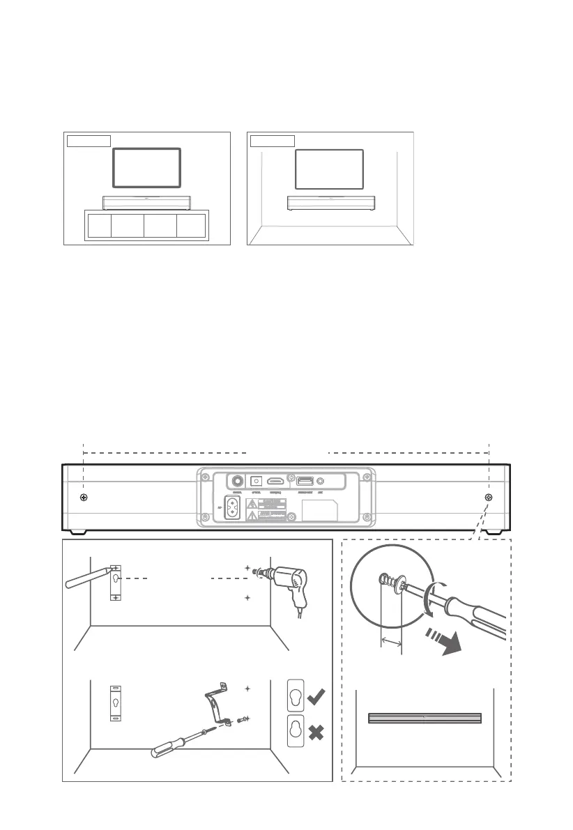 B If your TV is attached to a wall, you can mount the unit on the wall directly below the TV screen.